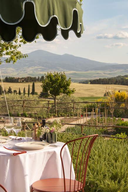 Lunch features hand-rolled pastas with traditional Tuscan sauces and vibrant garden-fresh salads, perfect for sunny days.