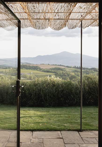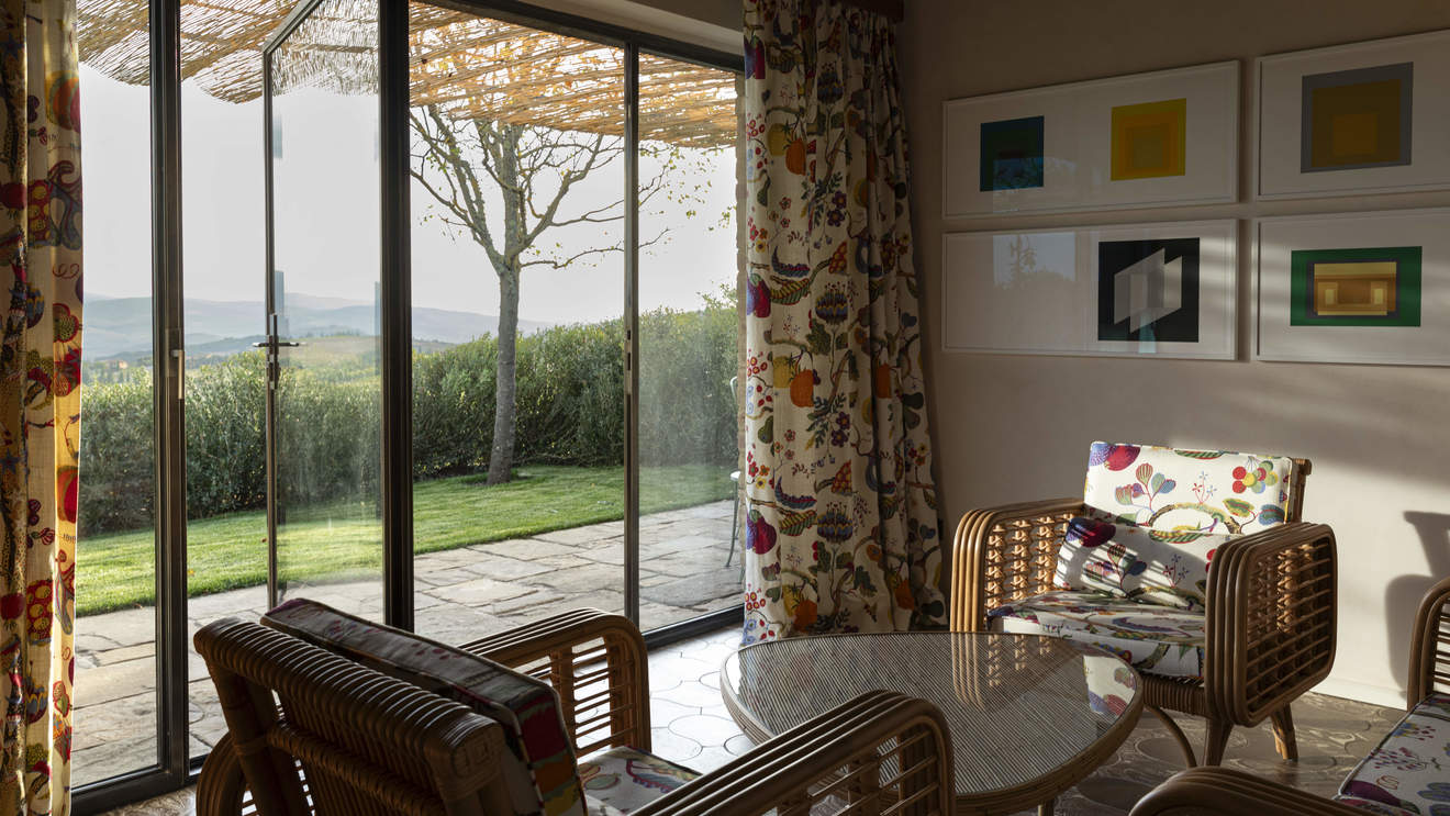 Private garden suite with breathtaking panoramic views of the Val d'Orcia, Fabbrica Pienza, and Monte Amiata. This suite boasts 2 walk-in wardrobes, a sitting room, and a spacious bathroom with bath and shower