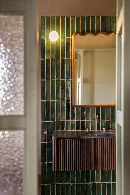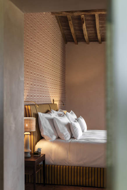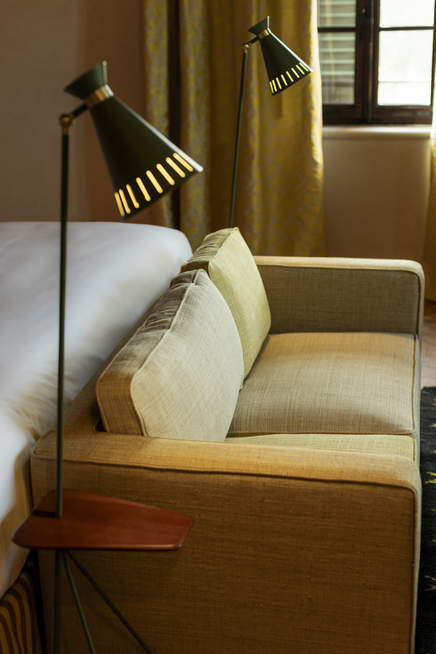 The beautiful geometric pattern by Chiarastella Catana complements the vintage and reupholstered furniture.