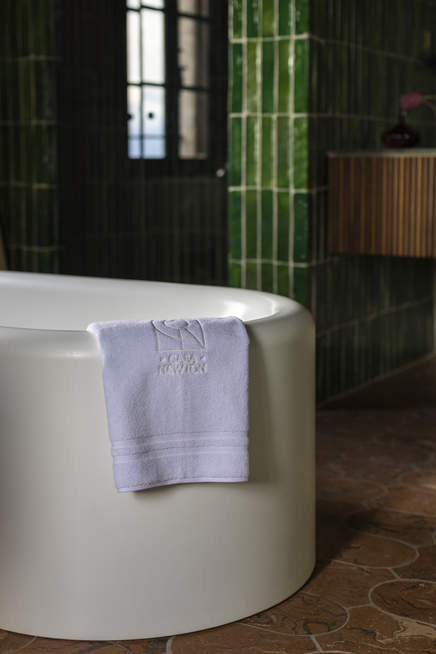 This spacious bathroom, with high beamed ceilings, is also home to a walk-in closet, a built-in mini bar, and a large bathtub in the centre.
