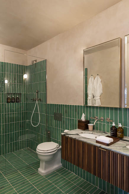 This bathroom has a double sink area and a spacious shower complete with Soeder products, a brand of sustainable Zurich-made products.