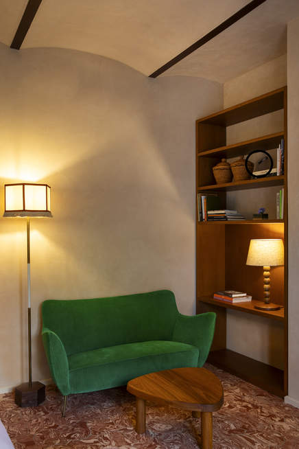 The bathroom has a stunning marble sink area covered with handmade green tiles. The spacious shower is completed with Soeder products, a brand of sustainable Zurich-made products.
