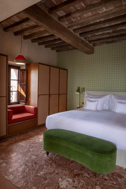 Located on the first floor, the Sofia suite is filled with light. It is accessible through the exterior double stairs on the front of the property, with a view over the rosemary garden, the chapel, and one of our many olive groves.