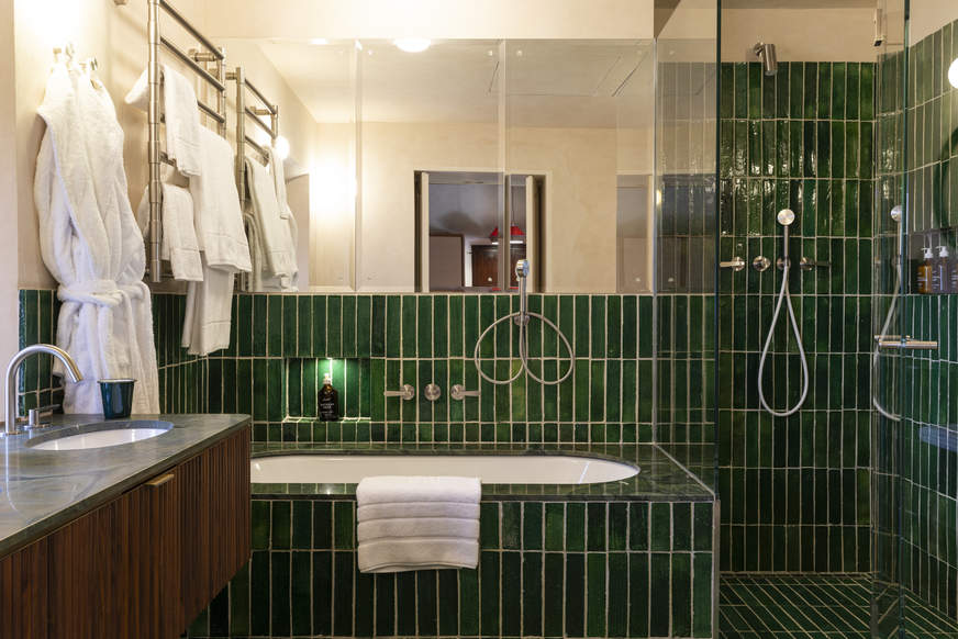 The deep green bathroom has everything you need for the ultimate pampering, with a view of the back garden while standing in front of the sink and a luxurious marble-topped bathtub.