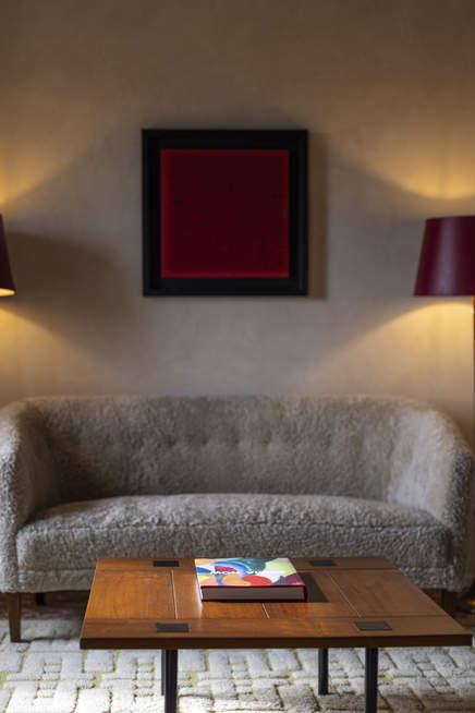 This idyllic room with warm tones and a blend of materials makes you feel welcome all year round. The living room walls are decorated with Italian fabrics and various artworks.